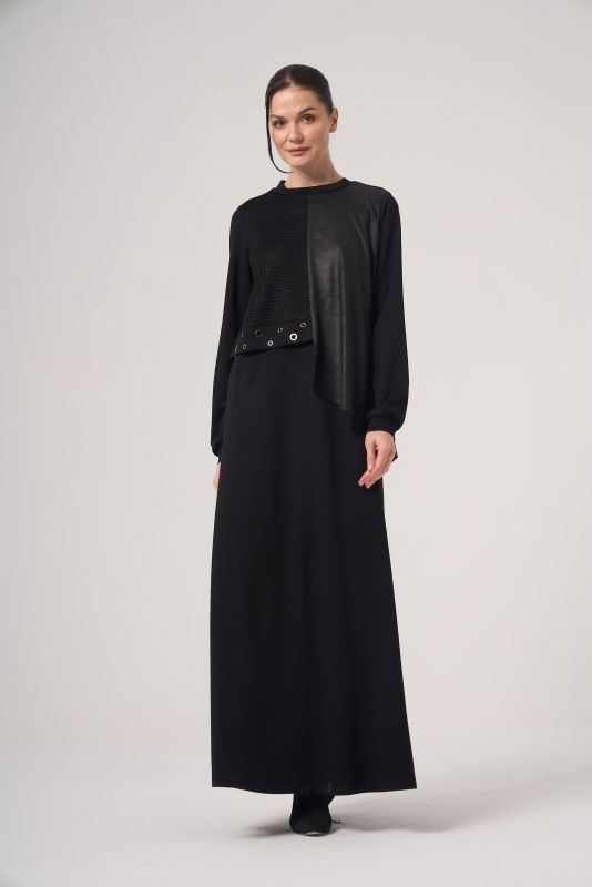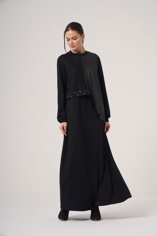 Deri Detaili Örme Elbise SİYAH