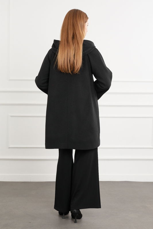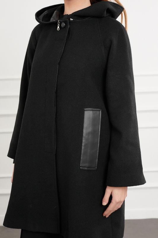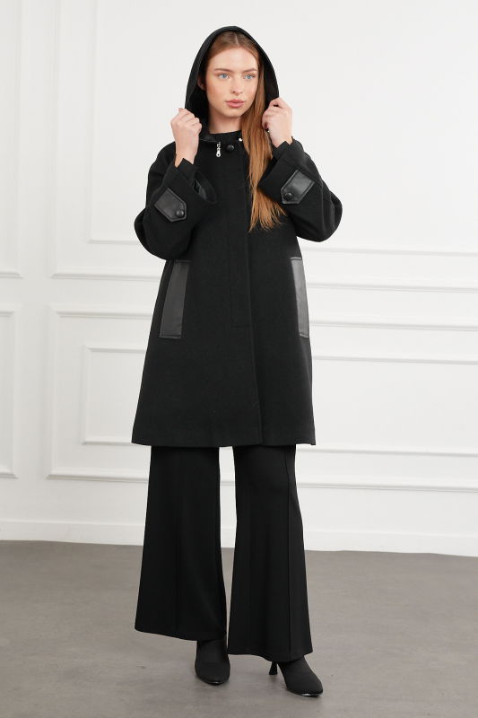 Kapşonlu Deri Detaili Kaban SİYAH